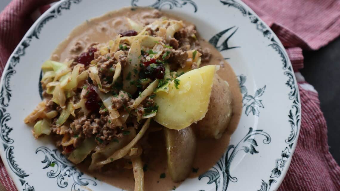 Vitkålspanna med kokt potatis är en variant på kålpudding, en uppskattad husmanskost. Vitkålspanna passar perfekt till vardags och till matlådan dagen efter. Recept - Vitkålspanna med kokt potatis, ca 4 pers Vitkålspanna 500 g Nötfärs (10 % fett) 2 msk Smör/olja 5 dl Matlagningsgrädde 4 % 2 msk Soja 2 msk Kalvfond 400 g Vitkål 1 st Gul lök 100 g Lingonsylt Lågkalori 1 tsk Salt 1/2 tsk Vitpeppar Tillbehör 800g Potatis Gör såhär: Skala /om så behövs) och koka potatis Strimla vitkålen fint. Stek vitkål så att den blir mjuk tillsammans med smör, salt och vitpeppar. När vitkålen mjuknat, häll över på en tallrik och låt stå åt sidan.…
