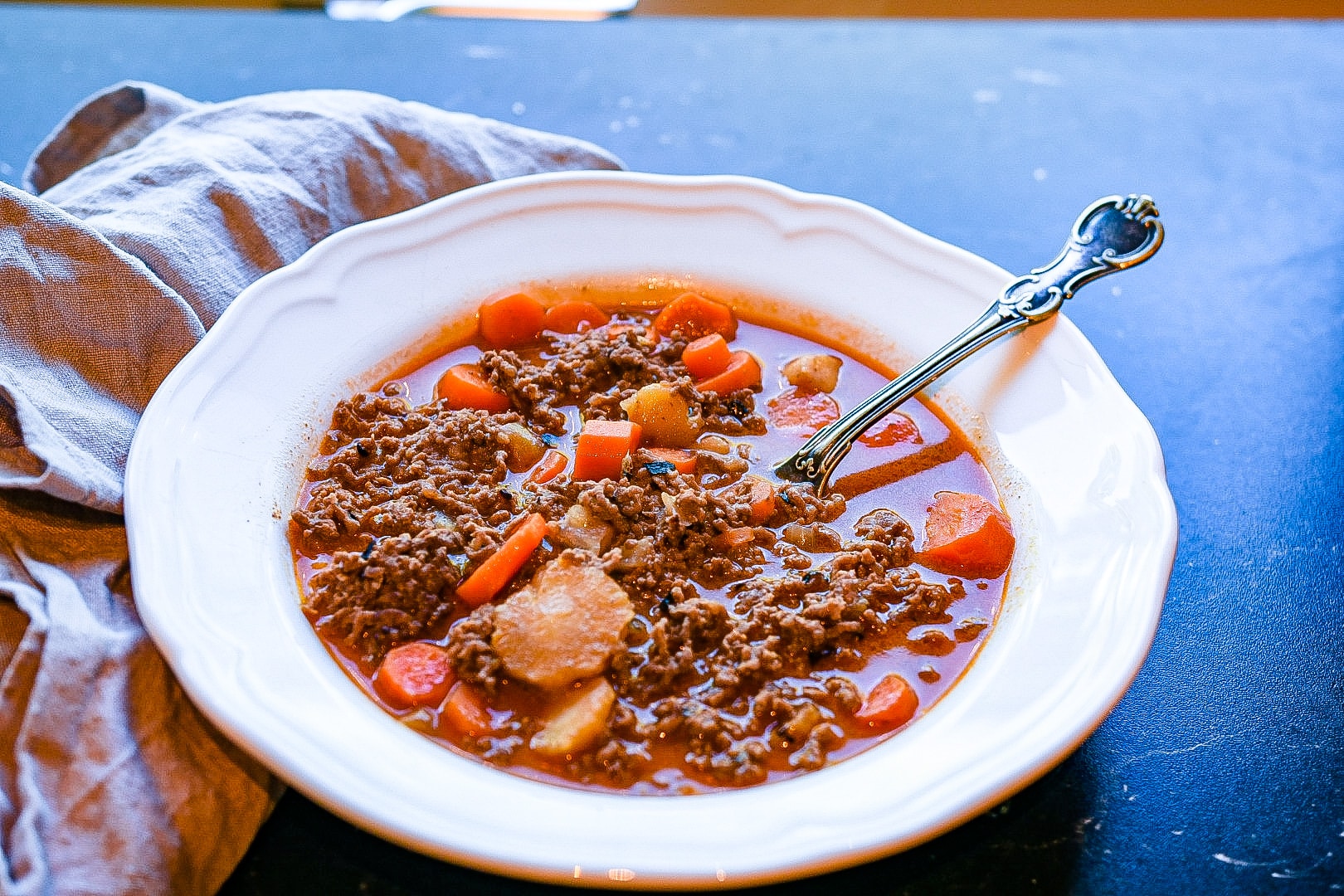 Recept – Snabb nötfärsgryta med pressad potatis och kålsallad