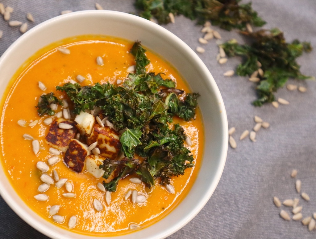 En krämig och värmande vegetarisk soppa med smak av rotfrukter, kokosmjölk och garam masala Detta recept på soppa är farligt enkel, det är bara att slänga in allt för att rosta i ugnen sedan mixa och fyll på med vätska och smaksättning. Fyll på med bönor i soppan för lite fibrer och tuggmotstånd och stek på halloumi för att öka upp proteinet, solrosfrön och grönkålschipsen för det knapriga. En smakkombination som är en fröjd för smaklökarna. Recept - Vegetarisk höstsoppa ca 6 pers Soppa 1 stor sötpotatis 3 palsternackor 400 g morötter 2 paprikor 1 stor gul lök 1/2 mellanstor vitlök 300 g tomater 1 msk Lantbuljong 2 krm svartpeppar Ca 1 msk…
