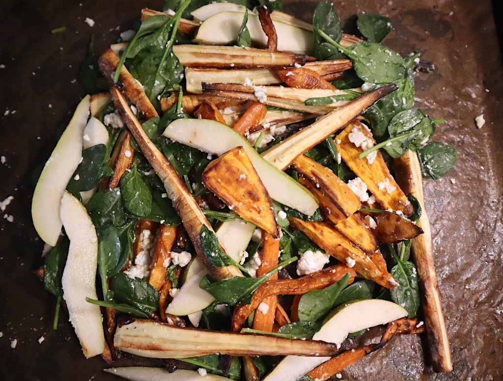 Vegetarisk varm sallad Här serveras en varm, vegetarisk sallad gjord på säsongens rotfrukt och toppad med päron och getost som gifter sig otroligt väl. Salladen är tänkt att att äta som den är i sitt lakto-vegetariska upplägg, men om du önskar kan du till exempel som vi gjorde lägga till ugnsrostad kyckling. Bland gärna ihop allt direkt på ugnsplåten för att låta smakerna sätta sig. Recept - Vegetarisk varm sallad med päron & getost , ca 4 pers Sallad 4 st palsternackor 4 st morötter 1/2 rotselleri 2 st sötpotatisar Salt och svartpeppar efter smak 1 msk olivolja 1 st päron 200 gram spenat 2 st/300 gram getost (100% getmjölk) 1…